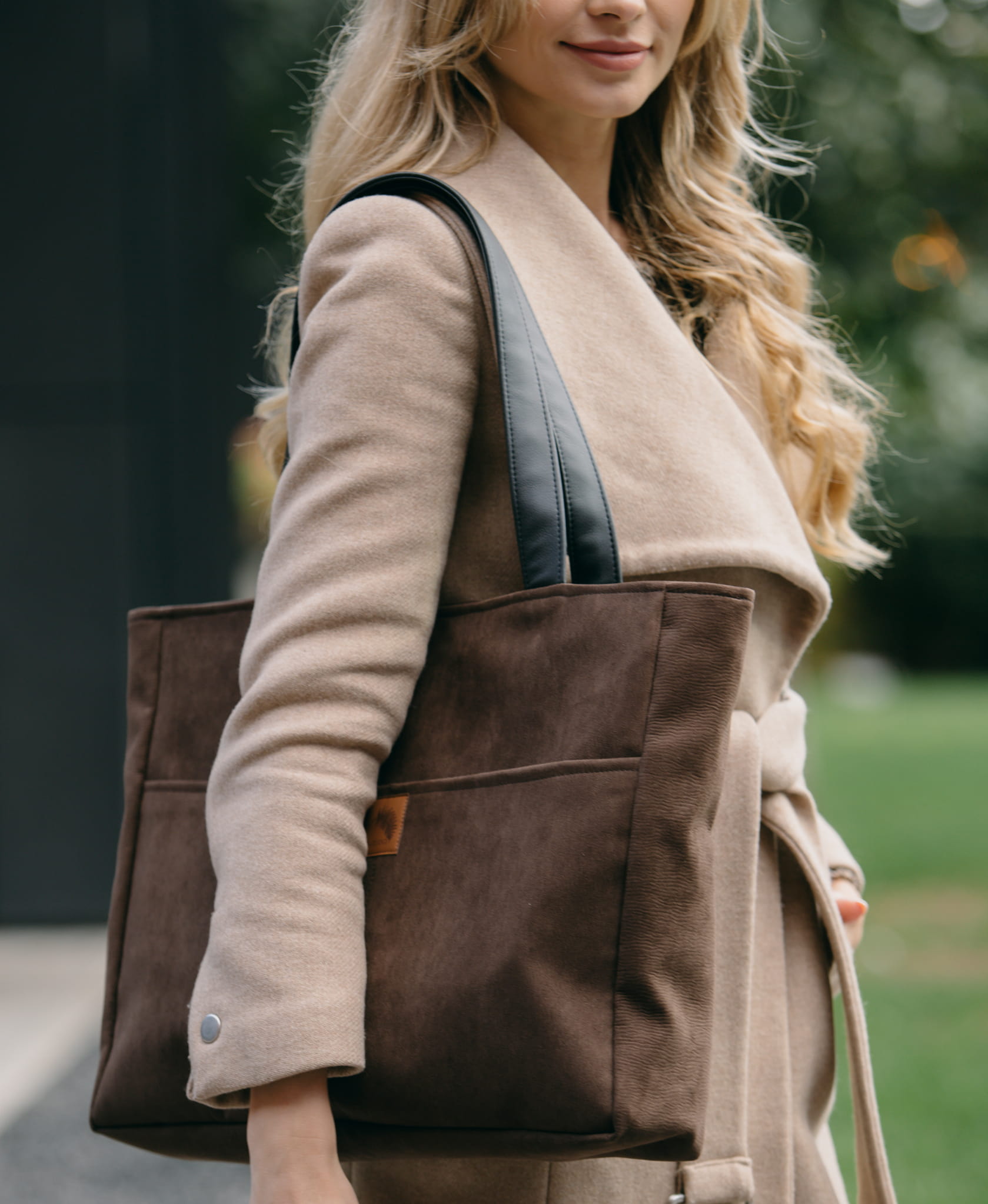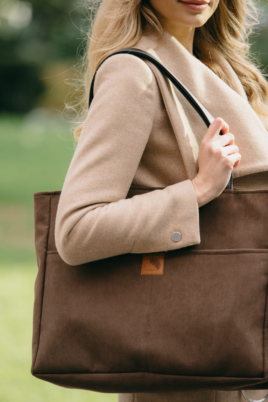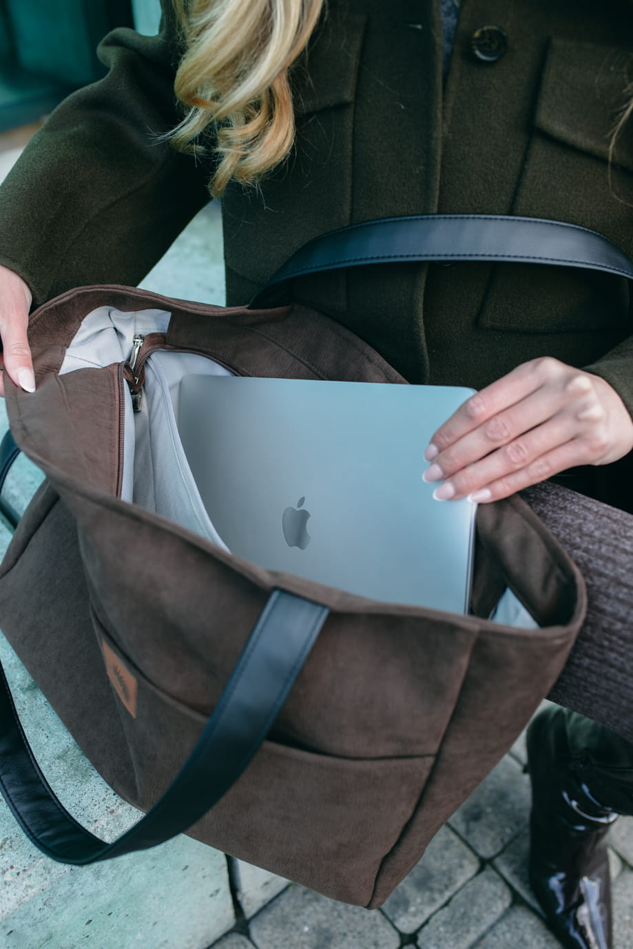 Duża, brązowa nubukowa torba z kieszenią na laptop.