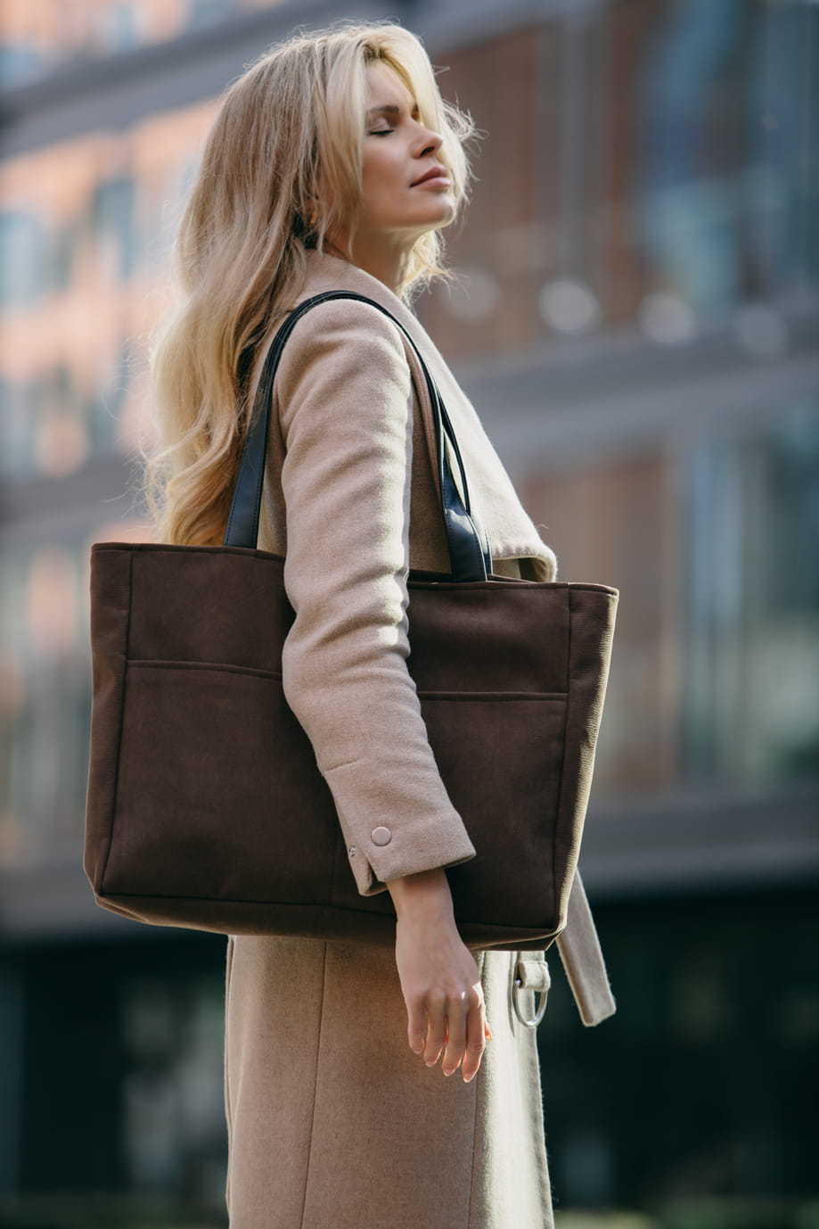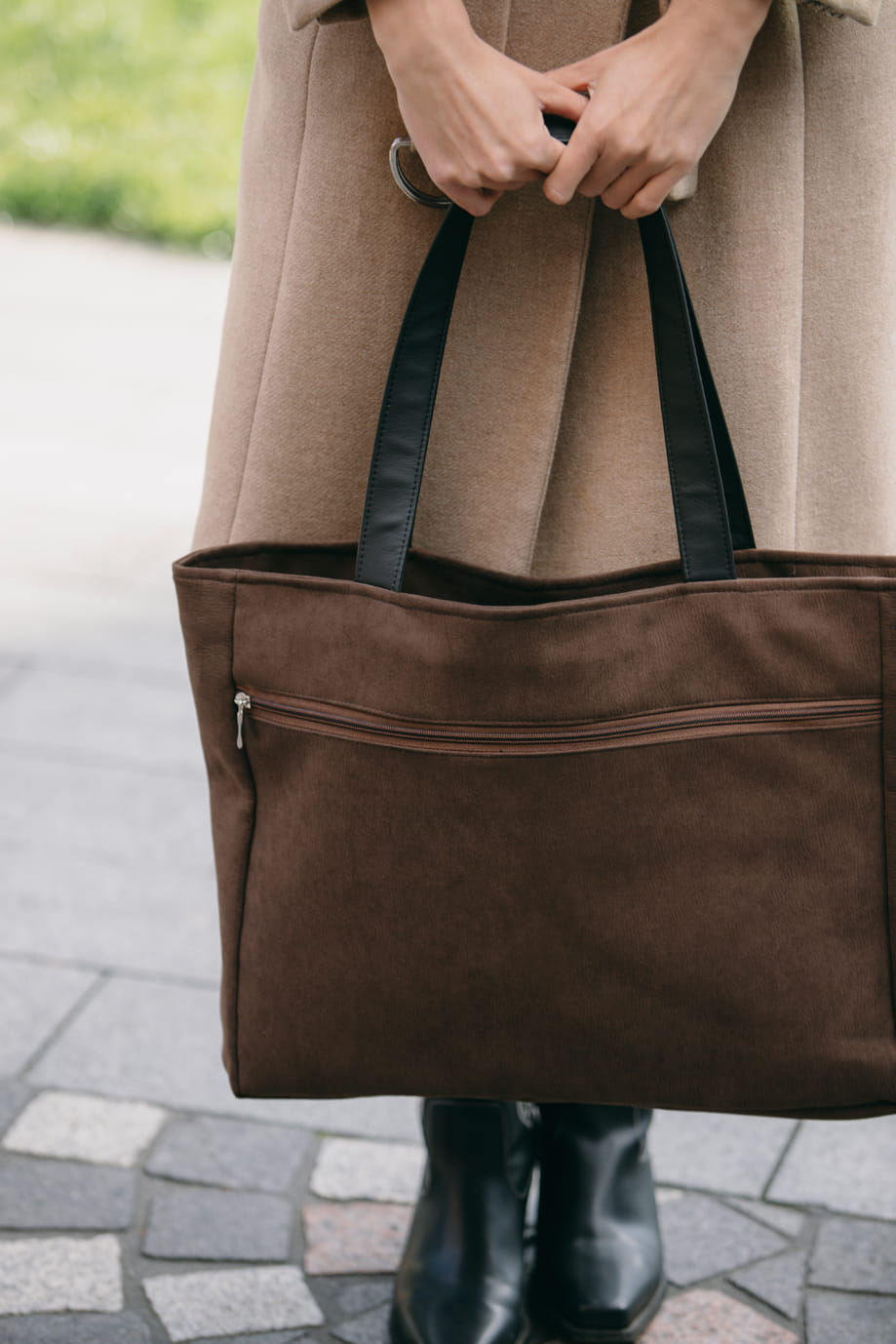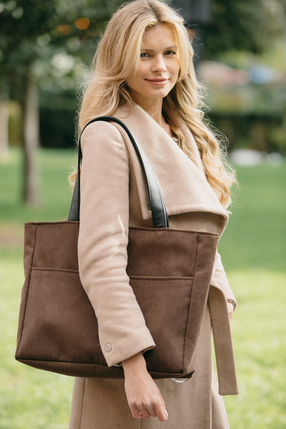 Duża, brązowa nubukowa torba z kieszenią na laptop.